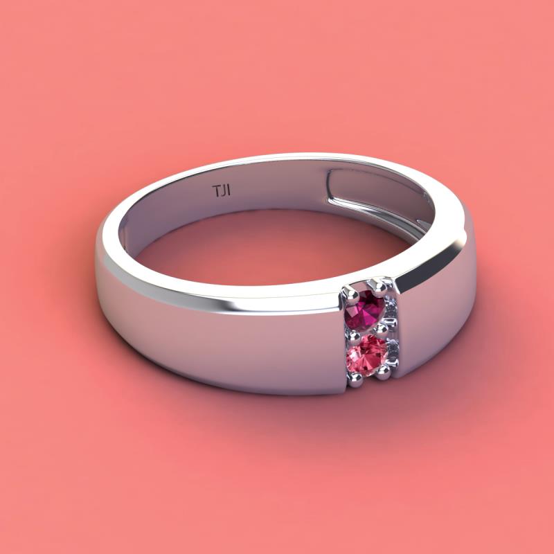 Don't be afraid of a little bling when it comes to men's wedding bands. This Men's Two Stone wedding band displays two Round shaped Rhodolite Garnet and Pink Tourmaline aligned in a sophisticated prong setting on the thick and high polished metal band.