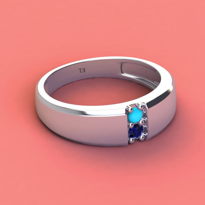 Don't be afraid of a little bling when it comes to men's wedding bands. This Men's Two Stone wedding band displays two Round shaped Turquoise and Blue Sapphire aligned in a sophisticated prong setting on the thick and high polished metal band.