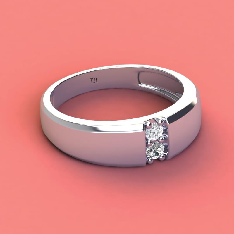Don't be afraid of a little bling when it comes to men's wedding bands. This Men's Two Stone wedding band displays two Round shaped White Sapphire and Diamond aligned in a sophisticated prong setting on the thick and high polished metal band.