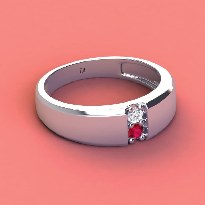 Don't be afraid of a little bling when it comes to men's wedding bands. This Men's Two Stone wedding band displays two Round shaped White Sapphire and Ruby aligned in a sophisticated prong setting on the thick and high polished metal band.