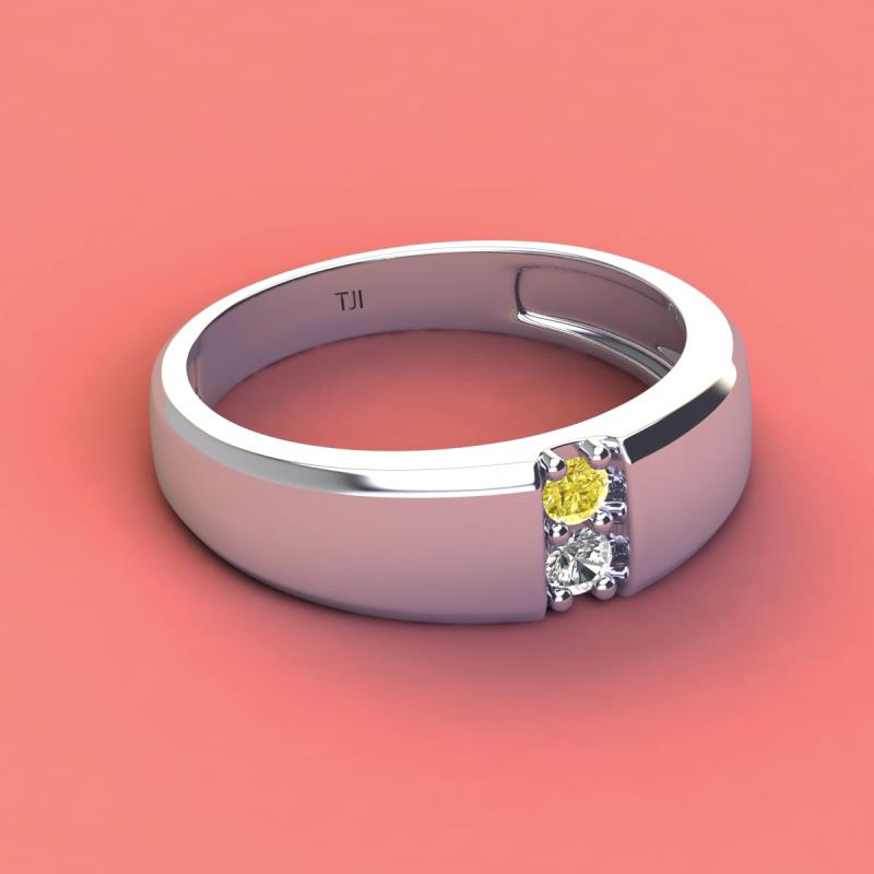 Don't be afraid of a little bling when it comes to men's wedding bands. This Men's Two Stone wedding band displays two Round shaped Yellow Diamond and Diamond aligned in a sophisticated prong setting on the thick and high polished metal band.