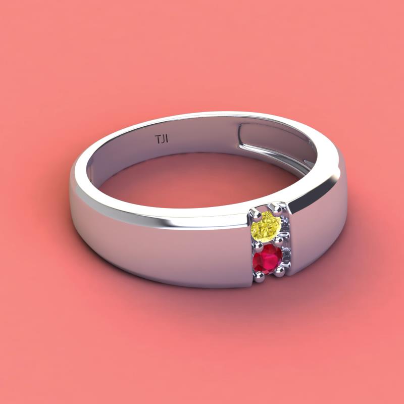 Don't be afraid of a little bling when it comes to men's wedding bands. This Men's Two Stone wedding band displays two Round shaped Yellow Diamond and Ruby aligned in a sophisticated prong setting on the thick and high polished metal band.