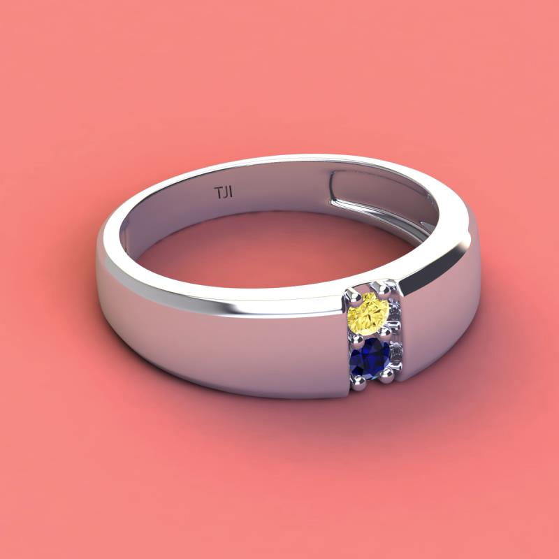 Don't be afraid of a little bling when it comes to men's wedding bands. This Men's Two Stone wedding band displays two Round shaped Yellow Sapphire and Blue Sapphire aligned in a sophisticated prong setting on the thick and high polished metal band.