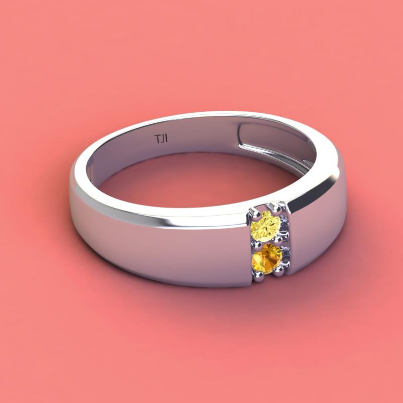 Don't be afraid of a little bling when it comes to men's wedding bands. This Men's Two Stone wedding band displays two Round shaped Yellow Sapphire and Citrine aligned in a sophisticated prong setting on the thick and high polished metal band.