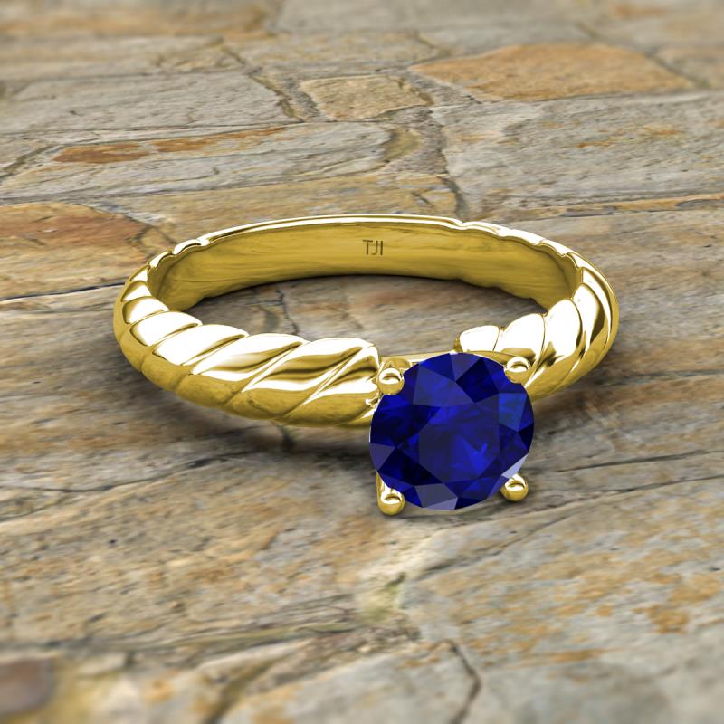 This Elegant Solitaire Engagement Ring in 14K Yellow Gold features a Shank wrapping around the Center Blue Sapphire with Twisted Rope design on the Band which Symbolize your endless Love for each other.