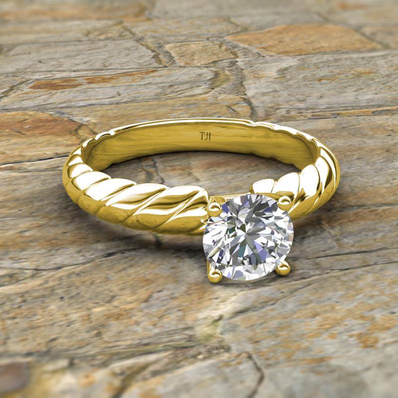 This Elegant Solitaire Engagement Ring in 18K Yellow Gold features a Shank wrapping around the Center Forever One Moissanite with Twisted Rope design on the Band which Symbolize your endless Love for each other.
