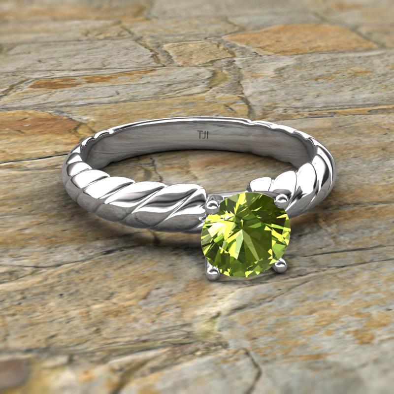 This Elegant Solitaire Engagement Ring in Platinum features a Shank wrapping around the Center Peridot with Twisted Rope design on the Band which Symbolize your endless Love for each other.