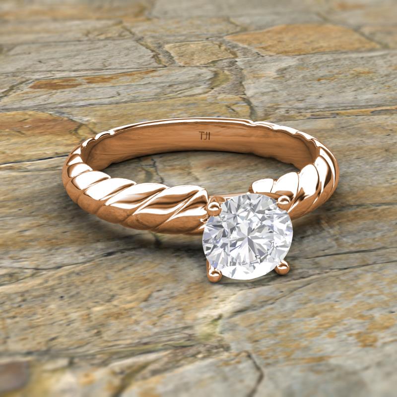 This Elegant Solitaire Engagement Ring in 14K Rose Gold features a Shank wrapping around the Center White Sapphire with Twisted Rope design on the Band which Symbolize your endless Love for each other.