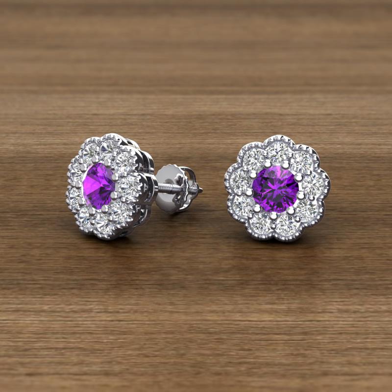 These gorgeous pair of halo stud earrings features Center Amethyst mounted in prong setting that is encircled by shimmering halos of 18 Round Diamonds and finished with intricate milgrain detailing.