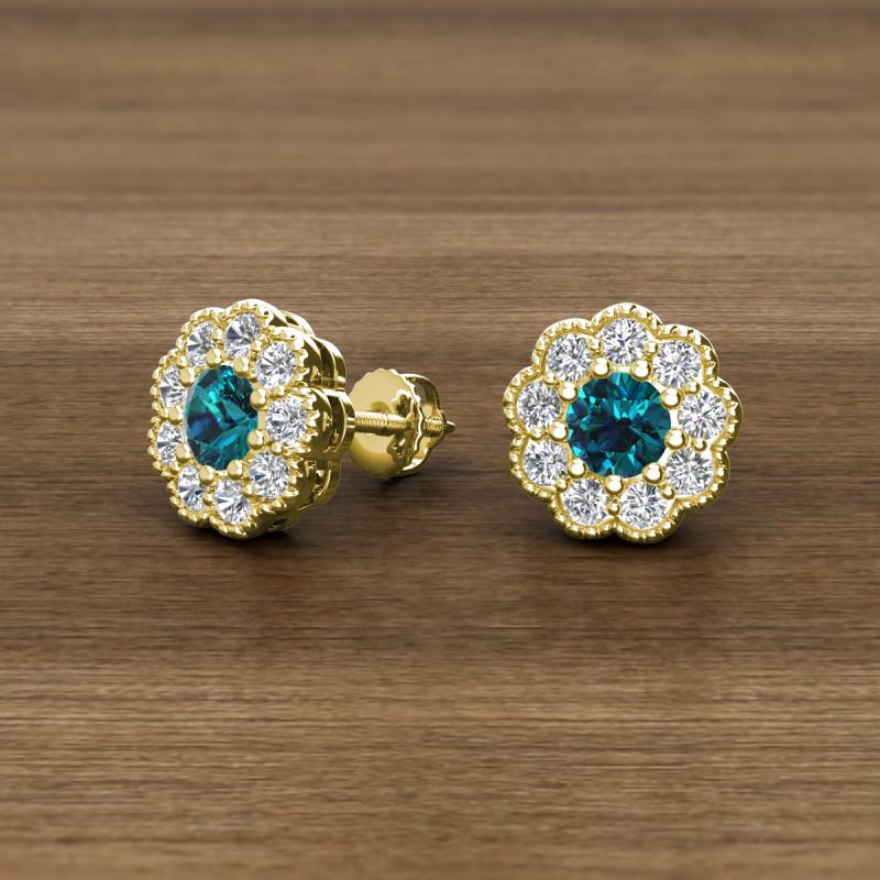 These gorgeous pair of halo stud earrings features Center Blue Diamond mounted in prong setting that is encircled by shimmering halos of 18 Round Diamonds and finished with intricate milgrain detailing.