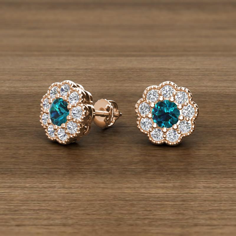 These gorgeous pair of halo stud earrings features Center Blue Diamond mounted in prong setting that is encircled by shimmering halos of 18 Round Diamonds and finished with intricate milgrain detailing.