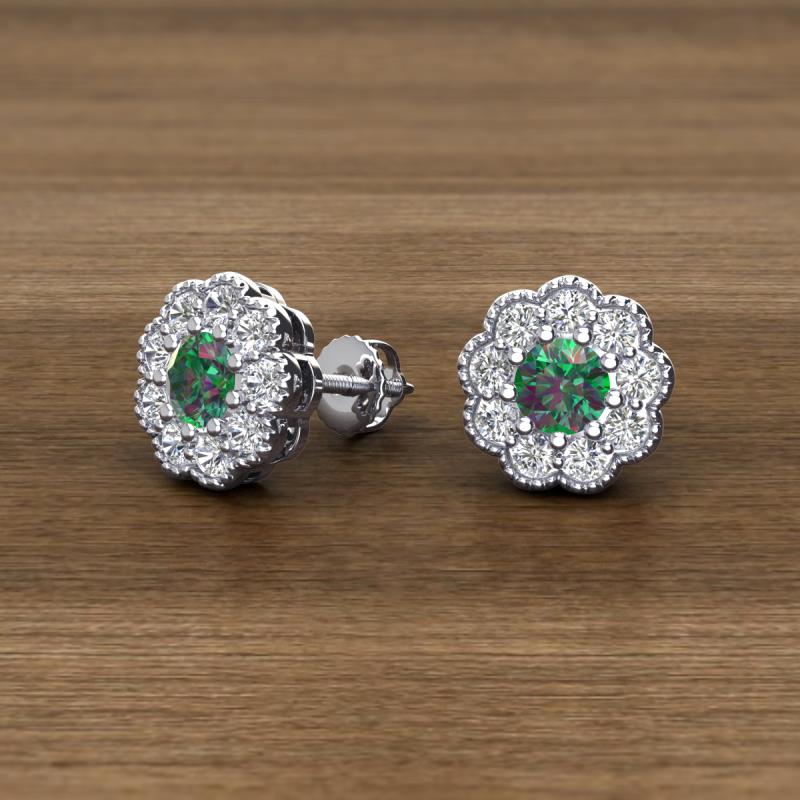 These gorgeous pair of halo stud earrings features Center Lab Created Alexandrite mounted in prong setting that is encircled by shimmering halos of 18 Round Diamonds and finished with intricate milgrain detailing.