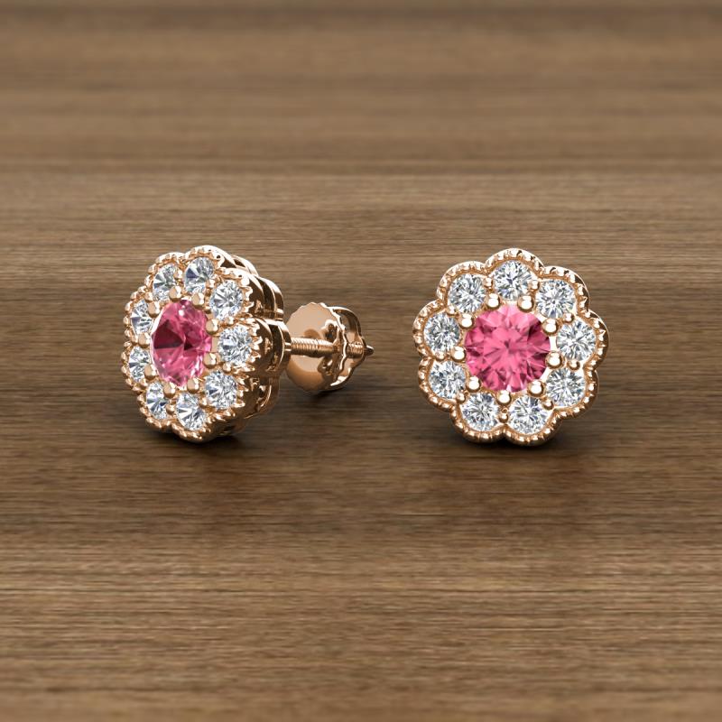These gorgeous pair of halo stud earrings features Center Pink Tourmaline mounted in prong setting that is encircled by shimmering halos of 18 Round Diamonds and finished with intricate milgrain detailing.