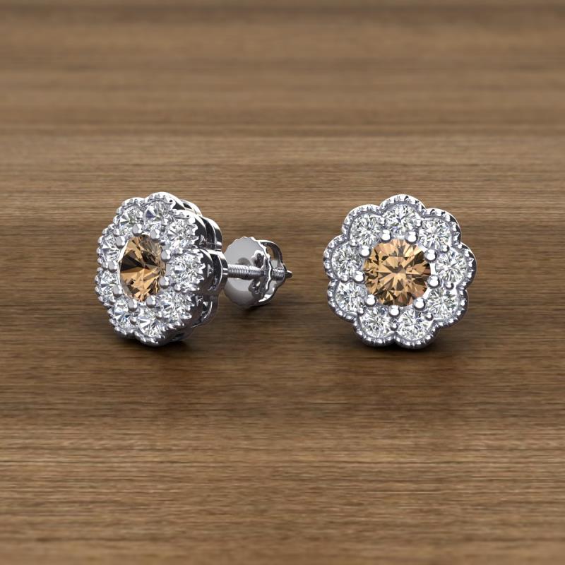 These gorgeous pair of halo stud earrings features Center Smoky Quartz mounted in prong setting that is encircled by shimmering halos of 18 Round Diamonds and finished with intricate milgrain detailing.