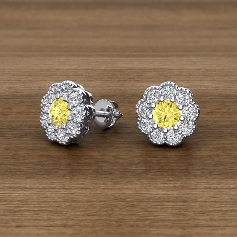 These gorgeous pair of halo stud earrings features Center Yellow Sapphire mounted in prong setting that is encircled by shimmering halos of 18 Round Diamonds and finished with intricate milgrain detailing.
