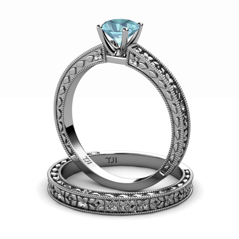 0.87 ct Classic Aquamarine (6.50 mm) Floral Engraved Solitaire Women Engagement Ring & Wedding Band Set in Platinum . More Details ...