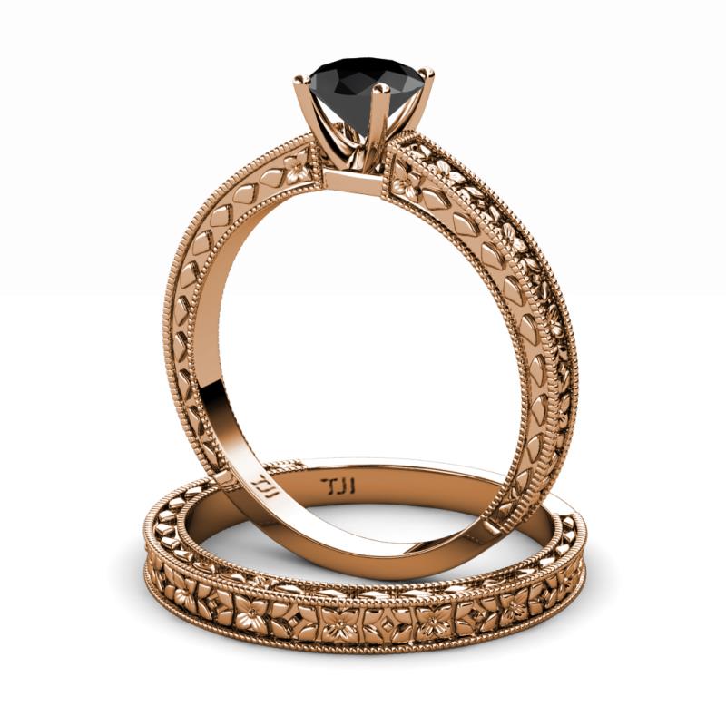 1.00 ct Classic Black Diamond (6.00 mm) Floral Engraved Solitaire Women Engagement Ring & Wedding Band Set in 14K Rose Gold . More Details ...