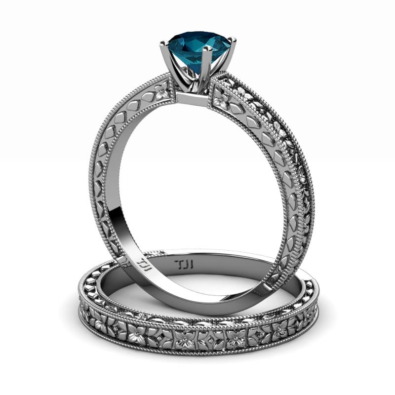 1.00 ct Classic Blue Diamond (6.50 mm) Floral Engraved Solitaire Women Engagement Ring & Wedding Band Set in 14K White Gold . More Details ...