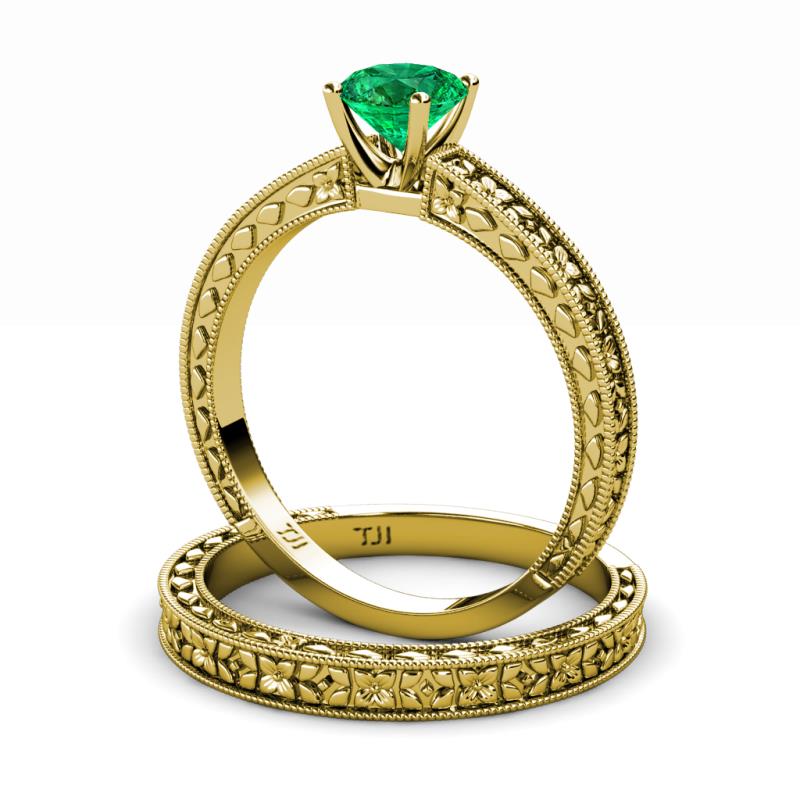 0.80 ct Classic Emerald (6.00 mm) Floral Engraved Solitaire Women Engagement Ring & Wedding Band Set in 14K Yellow Gold . More Details ...