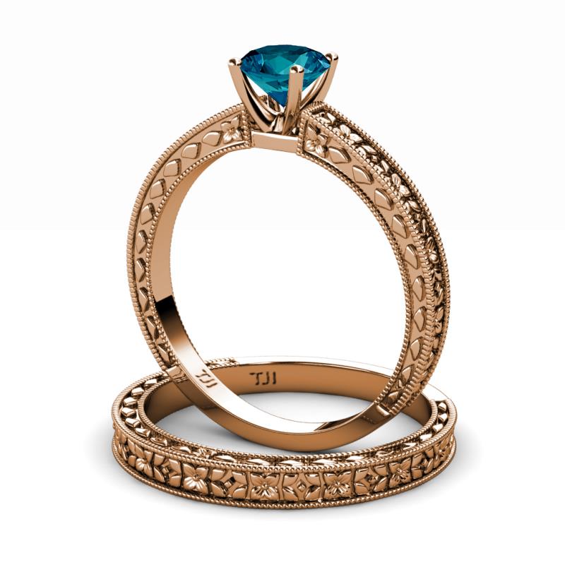 0.95 ct Classic London Blue Topaz (6.50 mm) Floral Engraved Solitaire Women Engagement Ring & Wedding Band Set in 14K Rose Gold . More Details ...