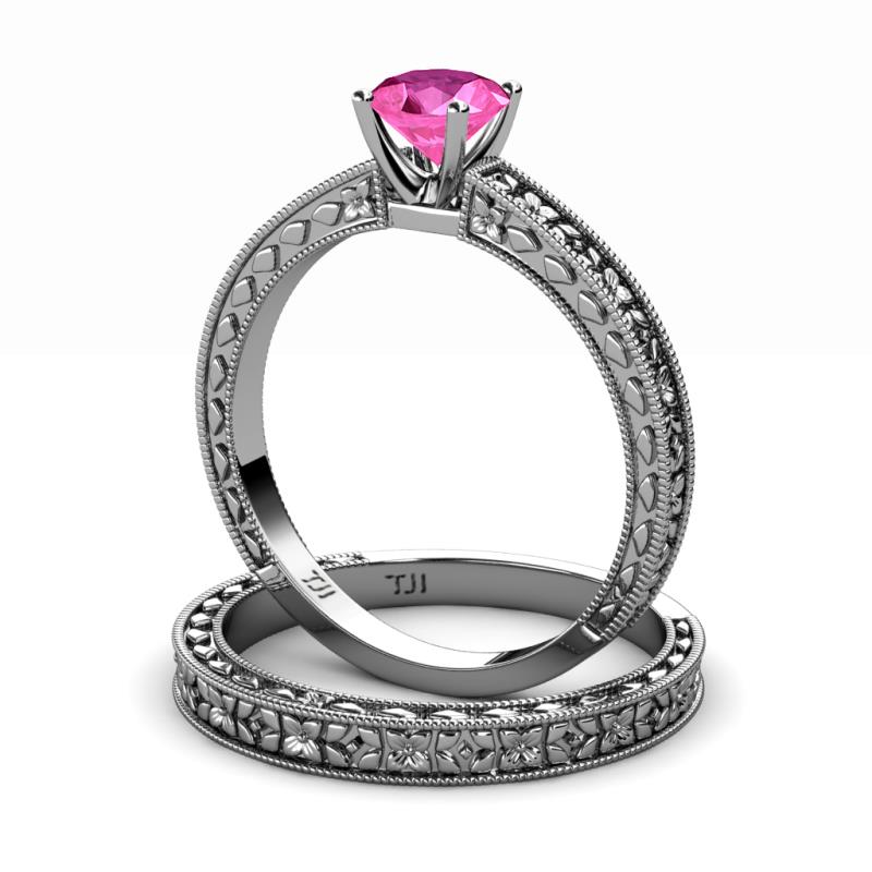 0.95 ct Classic Pink Sapphire (6.00 mm) Floral Engraved Solitaire Women Engagement Ring & Wedding Band Set in 18K White Gold . More Details ...