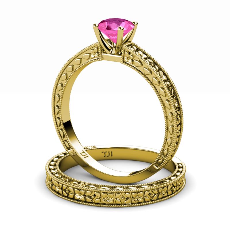 0.95 ct Classic Pink Sapphire (6.00 mm) Floral Engraved Solitaire Women Engagement Ring & Wedding Band Set in 18K Yellow Gold . More Details ...