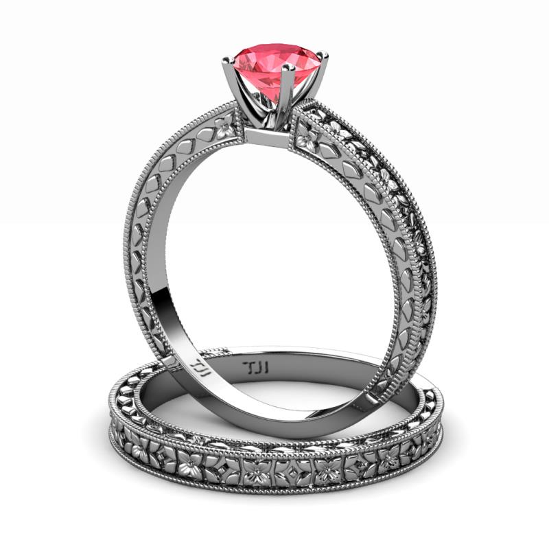 0.87 ct Classic Pink Tourmaline (6.50 mm) Floral Engraved Solitaire Women Engagement Ring & Wedding Band Set in Platinum . More Details ...