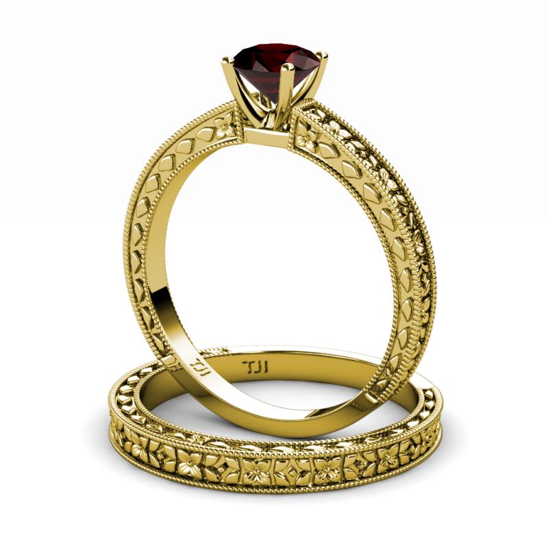 1.05 ct Classic Red Garnet (6.50 mm) Floral Engraved Solitaire Women Engagement Ring & Wedding Band Set in 18K Yellow Gold . More Details ...