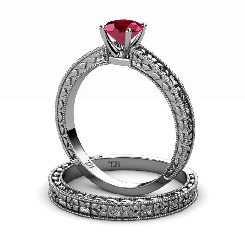 0.95 ct Classic Ruby (6.00 mm) Floral Engraved Solitaire Women Engagement Ring & Wedding Band Set in Platinum . More Details ...