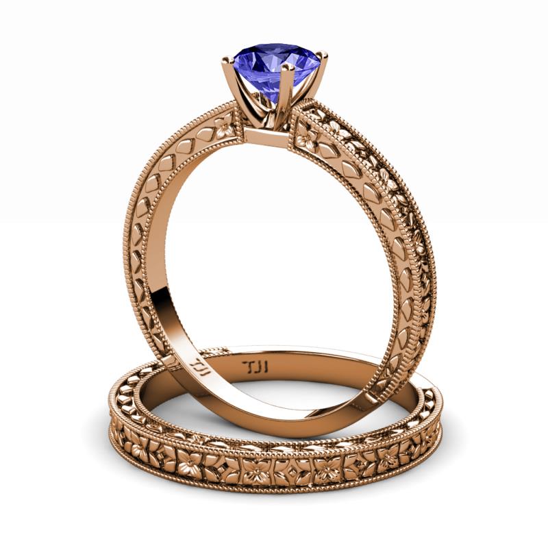 0.92 ct Classic Tanzanite (6.50 mm) Floral Engraved Solitaire Women Engagement Ring & Wedding Band Set in 14K Rose Gold . More Details ...