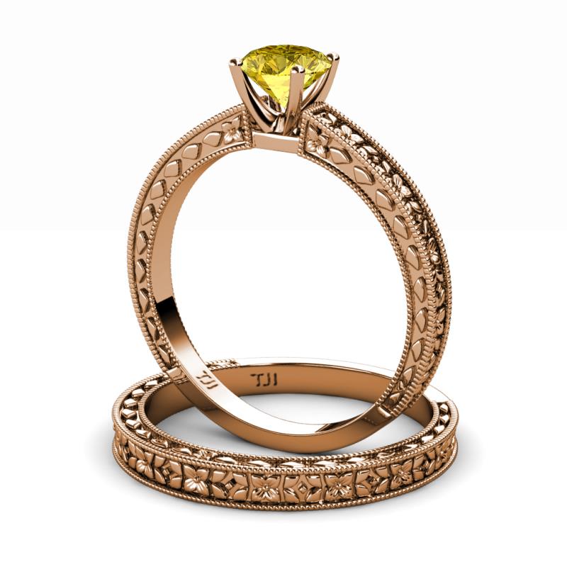 0.95 ct Classic Yellow Sapphire (6.00 mm) Floral Engraved Solitaire Women Engagement Ring & Wedding Band Set in 14K Rose Gold . More Details ...