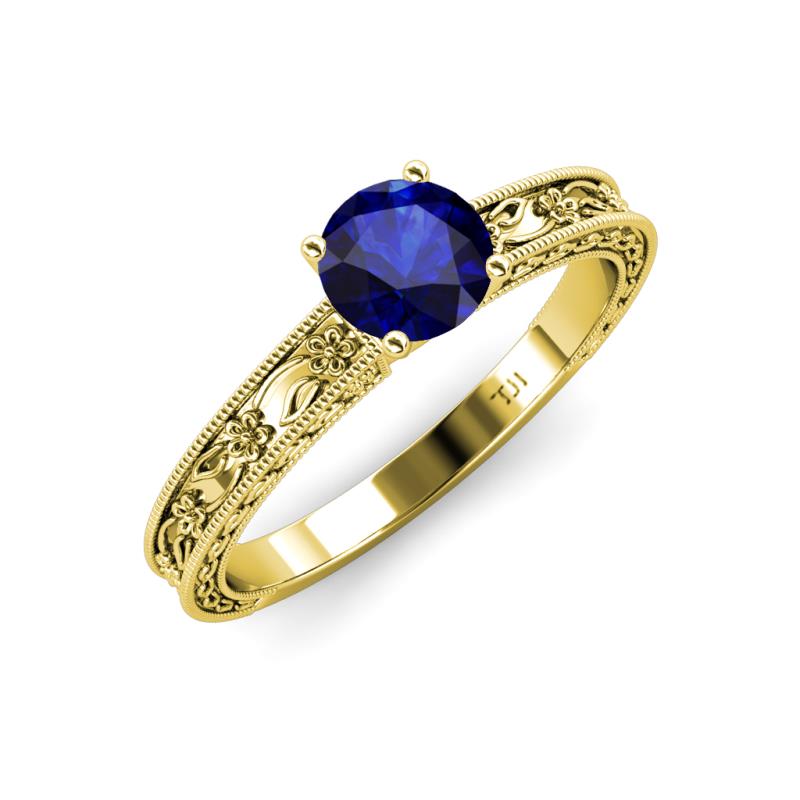 Round Blue Sapphire Floral Engraved Milgrain Womens Solitaire Engagement Ring 0.96 ct 14K Yellow Gold More Details ...
