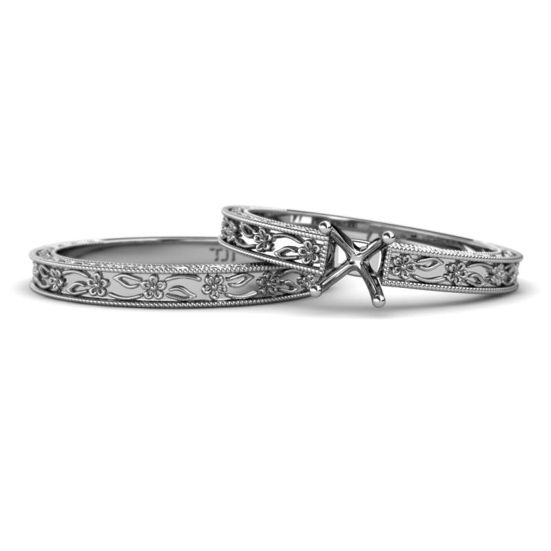 Four Prong Semi Mount Floral Engraved Solitaire Engagement Ring Setting & Matching Band 18K White Gold More Details ...