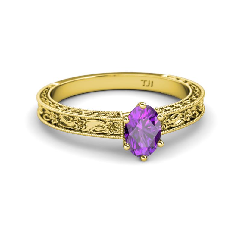 Oval Cut (7x5 mm) Amethyst 0.90 ct Floral Engraved Women Solitaire Engagement Ring 18K Yellow Gold More Details ...
