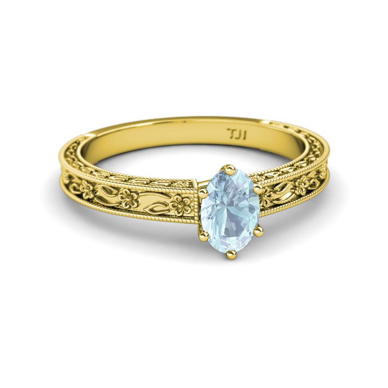 Oval Cut (7x5 mm) Aquamarine 0.90 ct Floral Engraved Women Solitaire Engagement Ring 18K Yellow Gold More Details ...