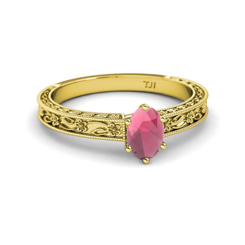 Oval Cut (7x5 mm) Rhodolite Garnet 1.05 ct Floral Engraved Women Solitaire Engagement Ring 18K Yellow Gold More Details ...