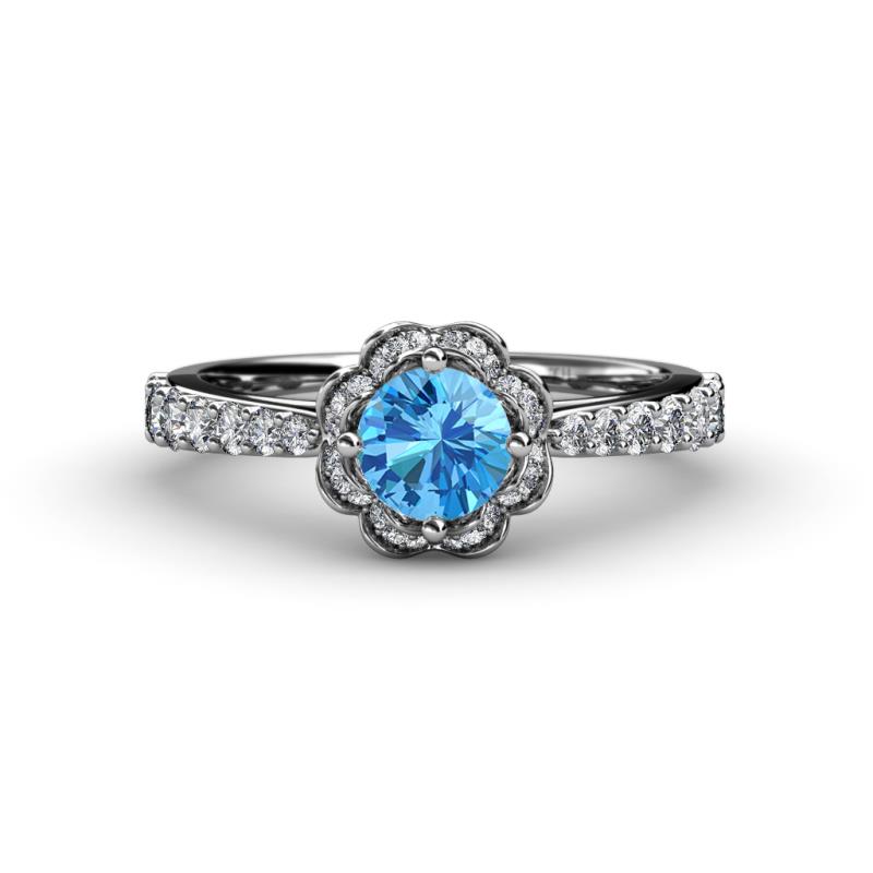 The Beauty and Simplicity of Halo Engagement Ring meets your Love with Center Blue Topaz which shines high above the Floral Crown of Diamond making it a Romantic Treasure for the years to come.