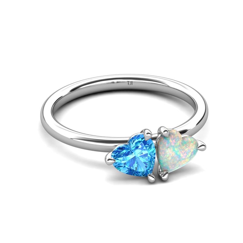 Celebrate your love with this stunning ring of 1.45 ctw features two heart-shaped Blue Topaz & Opal nestled together in a "toi et moi" design & the unique tiger claw prong setting adds a touch of edginess and modernity to the classic design symbolizing the unity and connection between two people in love & a perfect choice for the fashion-forward bride.