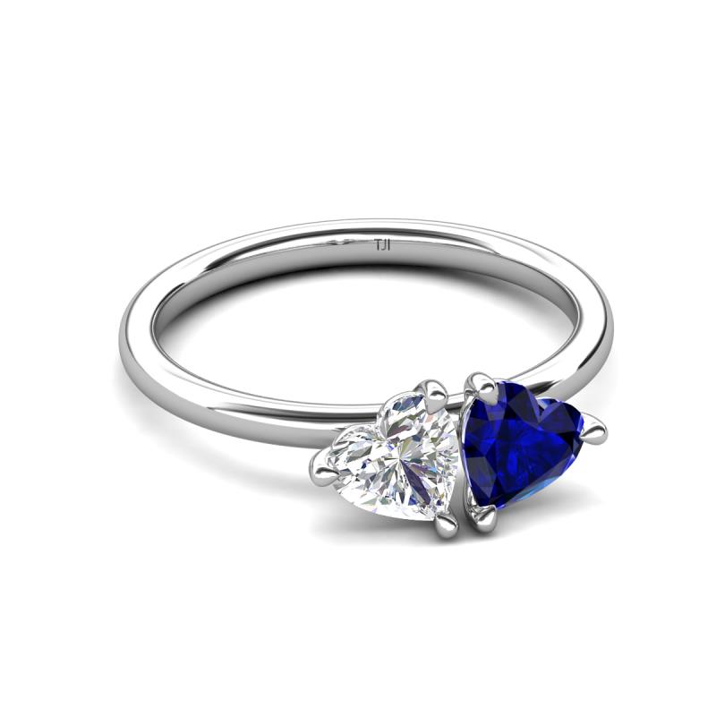 Celebrate your love with this stunning ring of 1.75 ctw features two heart-shaped GIA Certified Natural Diamond & Lab Created Blue Sapphire nestled together in a "toi et moi" design & the unique tiger claw prong setting adds a touch of edginess and modernity to the classic design symbolizing the unity and connection between two people in love & a perfect choice for the fashion-forward bride.