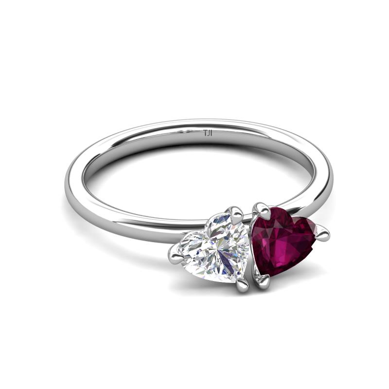 Celebrate your love with this stunning ring of 1.95 ctw features two heart-shaped IGI Certified Lab Grown Diamond & Rhodolite Garnet nestled together in a "toi et moi" design & the unique tiger claw prong setting adds a touch of edginess and modernity to the classic design symbolizing the unity and connection between two people in love & a perfect choice for the fashion-forward bride.