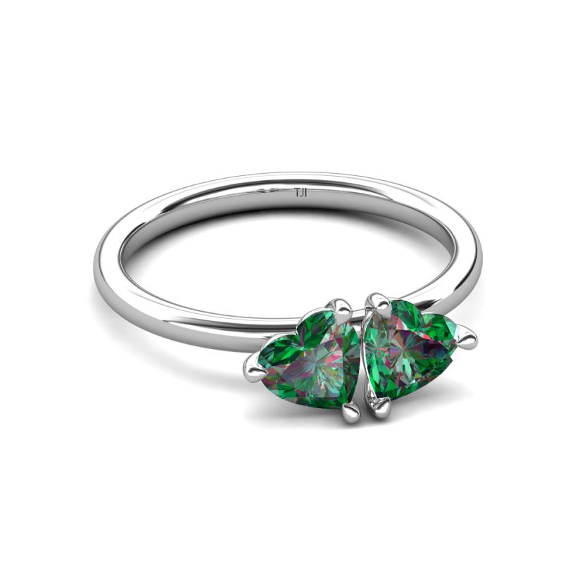 Celebrate your love with this stunning ring of 1.50 ctw features two heart-shaped Lab Created Alexandrite nestled together in a "toi et moi" design & the unique tiger claw prong setting adds a touch of edginess and modernity to the classic design symbolizing the unity and connection between two people in love & a perfect choice for the fashion-forward bride.