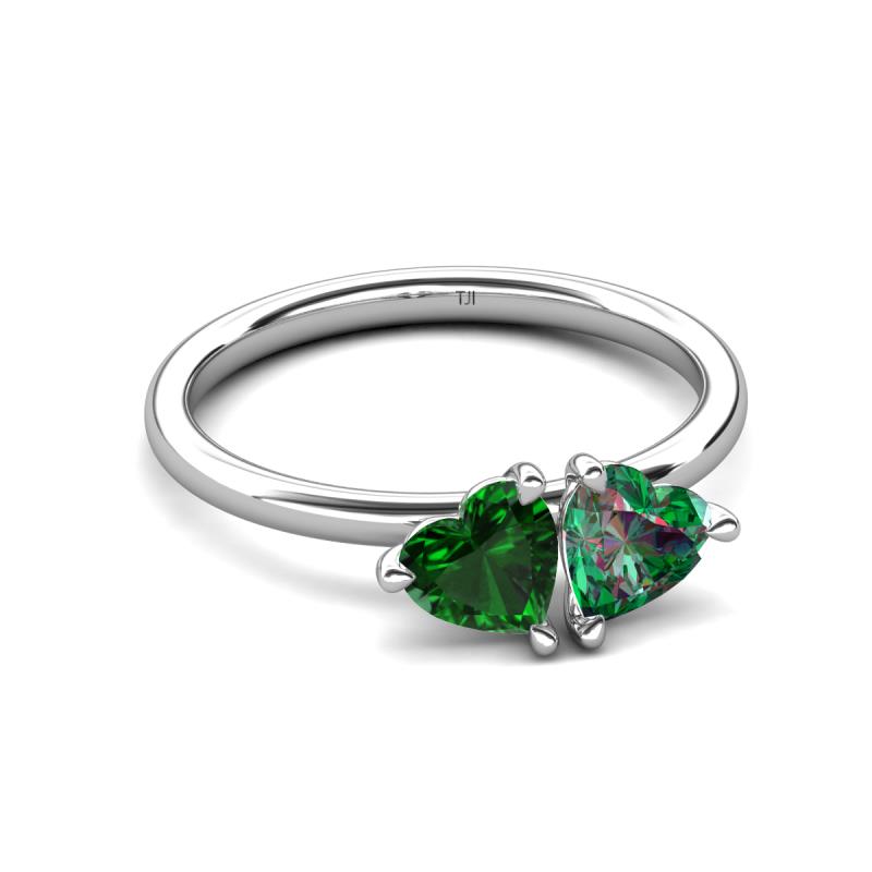 Celebrate your love with this stunning ring of 1.50 ctw features two heart-shaped Lab Created Emerald & Lab Created Alexandrite nestled together in a "toi et moi" design & the unique tiger claw prong setting adds a touch of edginess and modernity to the classic design symbolizing the unity and connection between two people in love & a perfect choice for the fashion-forward bride.