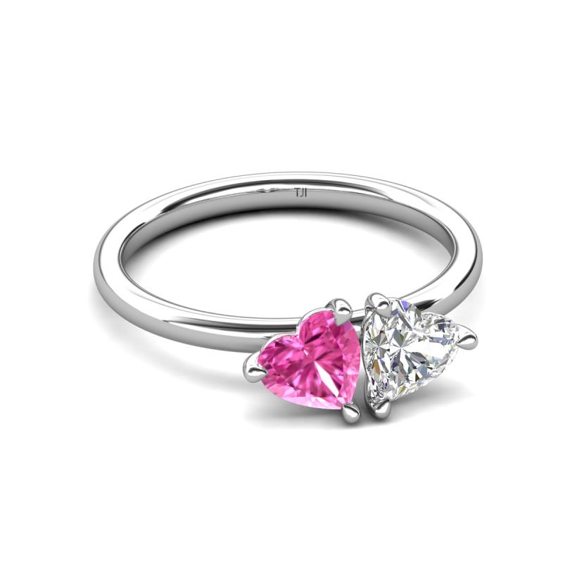 Celebrate your love with this stunning ring of 1.75 ctw features two heart-shaped Lab Created Pink Sapphire & GIA Certified Natural Diamond nestled together in a "toi et moi" design & the unique tiger claw prong setting adds a touch of edginess and modernity to the classic design symbolizing the unity and connection between two people in love & a perfect choice for the fashion-forward bride.