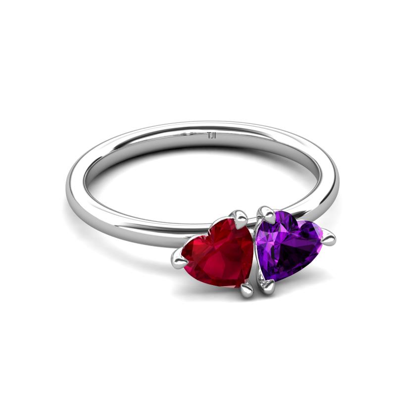 • 1 Lab Created Ruby Heart Shape 0.80 ctw/6.00 mm & 1 Amethyst Heart Shape 0.68 ctw/6.00 mm Two Stone Duo Engagement Ring set in a Tiger Claw Prong Setting.