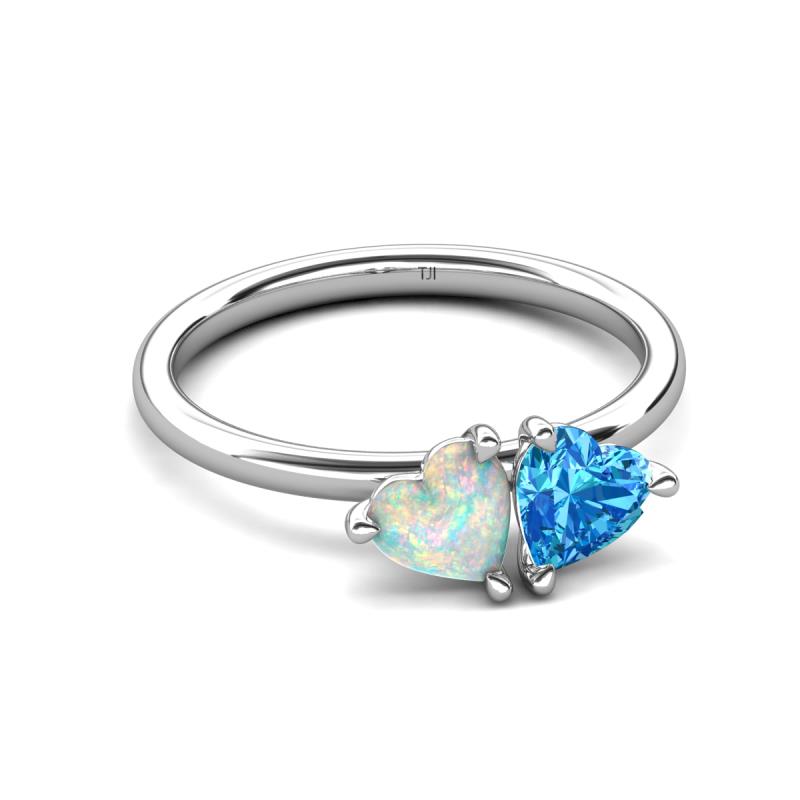 Celebrate your love with this stunning ring of 1.45 ctw features two heart-shaped Opal & Blue Topaz nestled together in a "toi et moi" design & the unique tiger claw prong setting adds a touch of edginess and modernity to the classic design symbolizing the unity and connection between two people in love & a perfect choice for the fashion-forward bride.