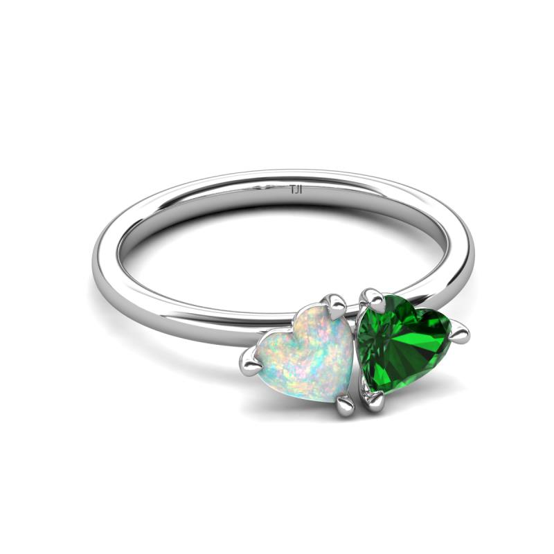 Celebrate your love with this stunning ring of 1.20 ctw features two heart-shaped Opal & Lab Created Emerald nestled together in a "toi et moi" design & the unique tiger claw prong setting adds a touch of edginess and modernity to the classic design symbolizing the unity and connection between two people in love & a perfect choice for the fashion-forward bride.