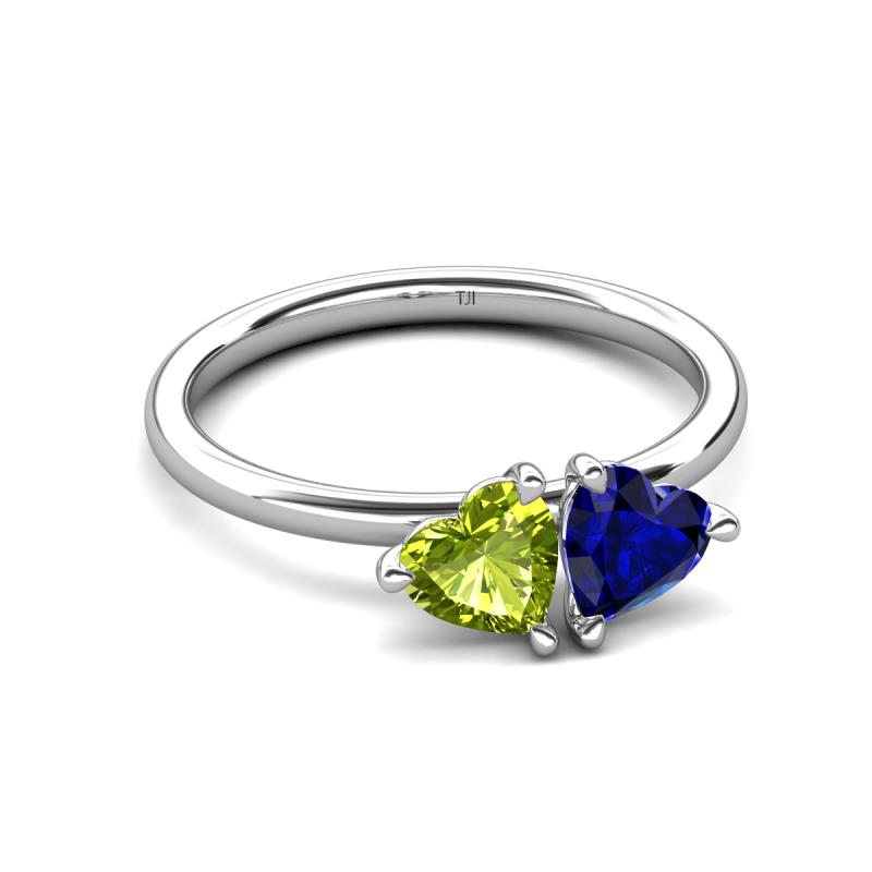 Celebrate your love with this stunning ring of 1.85 ctw features two heart-shaped Peridot & Lab Created Blue Sapphire nestled together in a "toi et moi" design & the unique tiger claw prong setting adds a touch of edginess and modernity to the classic design symbolizing the unity and connection between two people in love & a perfect choice for the fashion-forward bride.