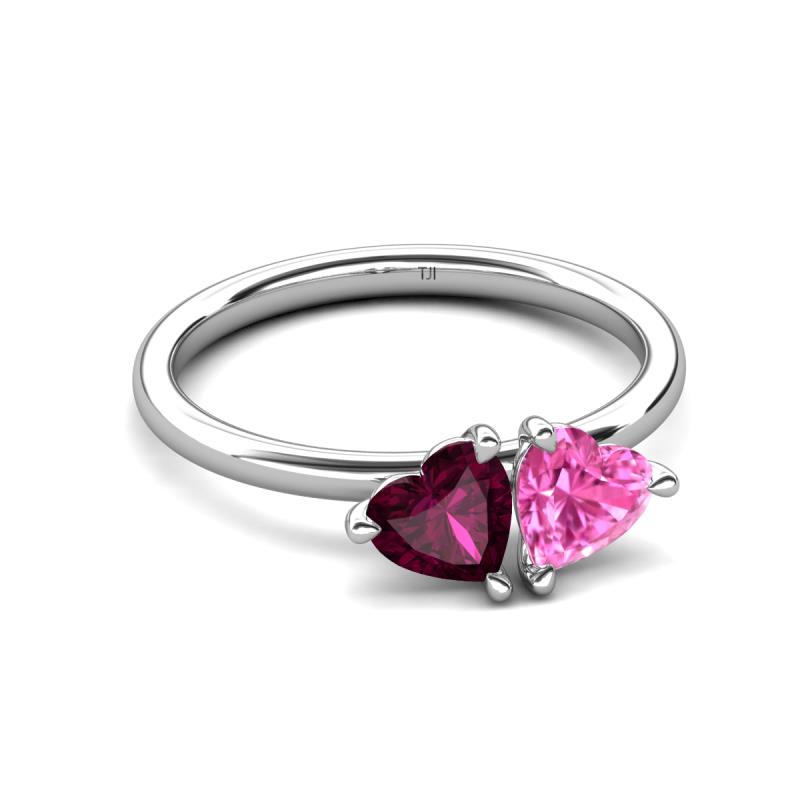 Celebrate your love with this stunning ring of 2.00 ctw features two heart-shaped Rhodolite Garnet & Lab Created Pink Sapphire nestled together in a "toi et moi" design & the unique tiger claw prong setting adds a touch of edginess and modernity to the classic design symbolizing the unity and connection between two people in love & a perfect choice for the fashion-forward bride.