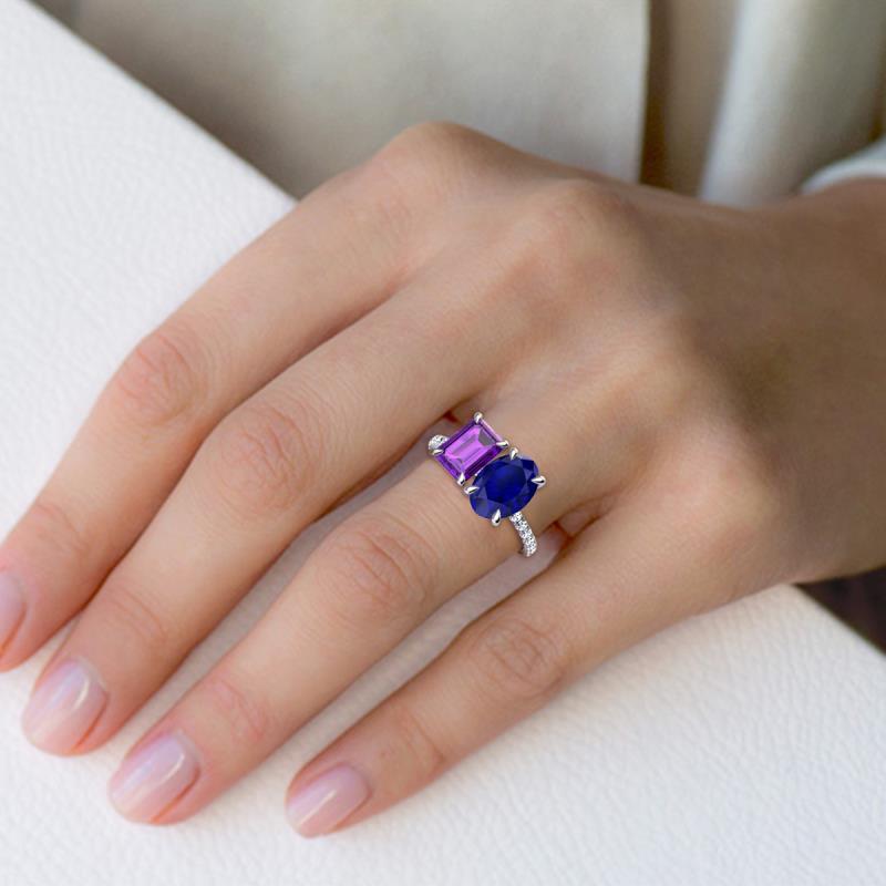 Undeniably dramatic, a 2 stone duo ring a unique treasure to symbolize your forever love. Coupled together Emerald Cut Amethyst and an Oval Blue Sapphire accentuated with 16 shimmering diamonds a perfect representation of two lives joining together as one.