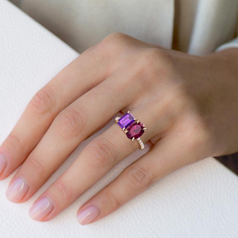 Undeniably dramatic, a 2 stone duo ring a unique treasure to symbolize your forever love. Coupled together Emerald Cut Amethyst and an Oval Rhodolite Garnet accentuated with 16 shimmering diamonds a perfect representation of two lives joining together as one.